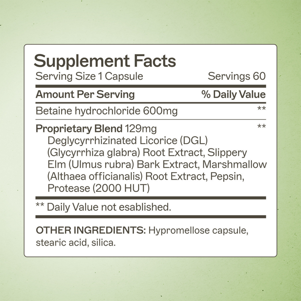 Betaine hydrochloride, proprietary blend deglycyrrhizinated licorice (DGL) (glycyrrhiza glabra) root extract, slippery elm (ulmus rubra) bark extract, marshmallow (althaea ocianalis) root extract, pepsin, protease (2000 HUT)), hypromellose capsule, stearic acid, silica