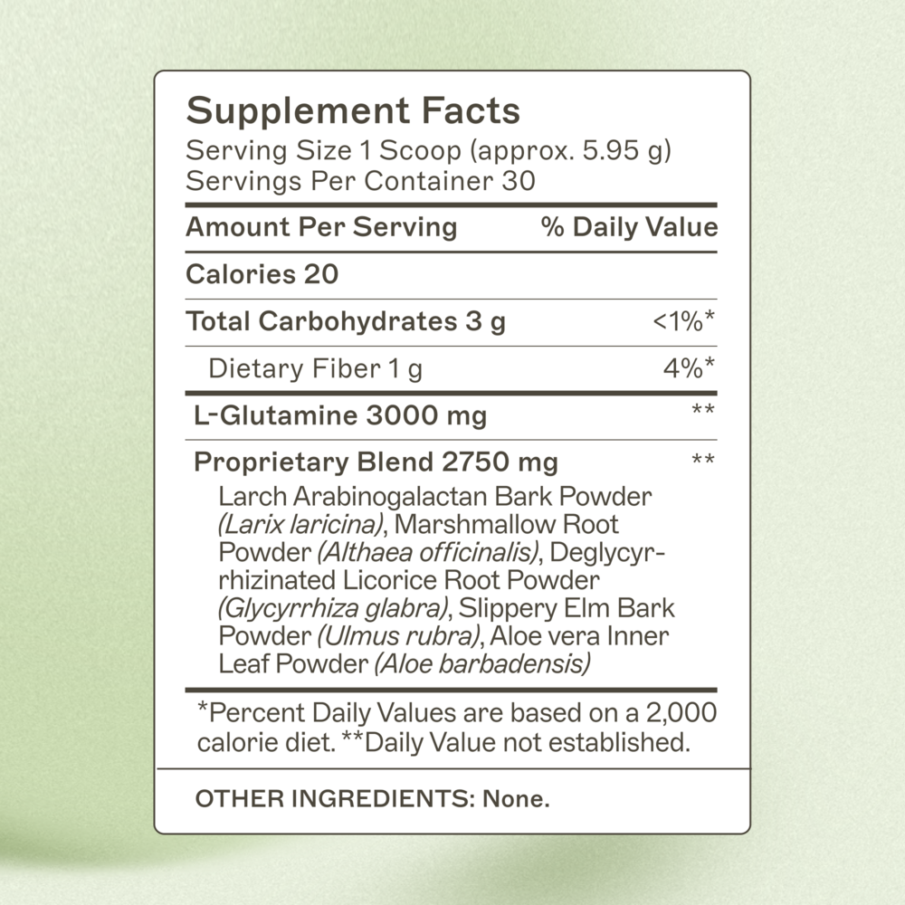 Larch Arabinogalactan Bark Powder (Larix laricina), Marshmallow Root Powder (Althaea officinalis), Deglycyrrhizinated Licorice Root Powder (Glycyrrhiza glabra), Slippery Elm Bark Powder (Ulmus rubra), Aloe vera Inner Leaf Powder (Aloe barbadensis)