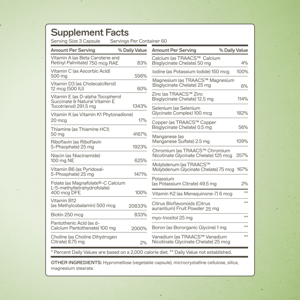 Comprehensive, iron-free blend of vitamins and minerals selected for premium absorption and bioavailability