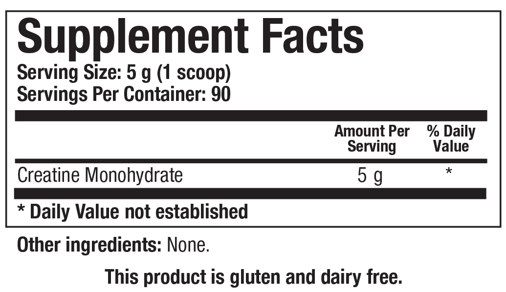 This product provides 5 grams per serving of pure creatine monohydrate, a compound well-studied for its role in supporting muscle energy metabolism and mental health. Creatine helps maintain optimal levels of ATP (adenosine triphosphate), making it especially valuable for high-intensity exercise, repeated bouts of activity and neurological demands.* This formula features micronized creatine monohydrate for improved solubility and ease of mixing.
