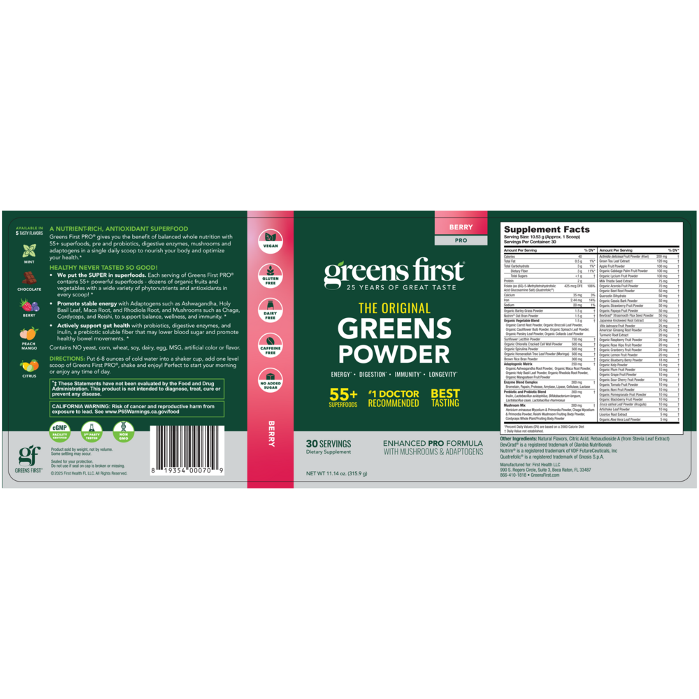 Greens First Berry Pro contains 54 different super foods, extracts and concentrates, including fruits, vegetables, probiotics, soluble fiber, natural flavonoids and digestive enzymes. Greens First Berry Pro superfoods are first juiced, then naturally spray dried without solvents at low temperature, leaving all the important nutrients intact. Greens First Berry Pro contains no yeast, corn, wheat, soy, dairy, egg, MSG, preservatives, artificial color or flavor, gluten, and is non-GMO.