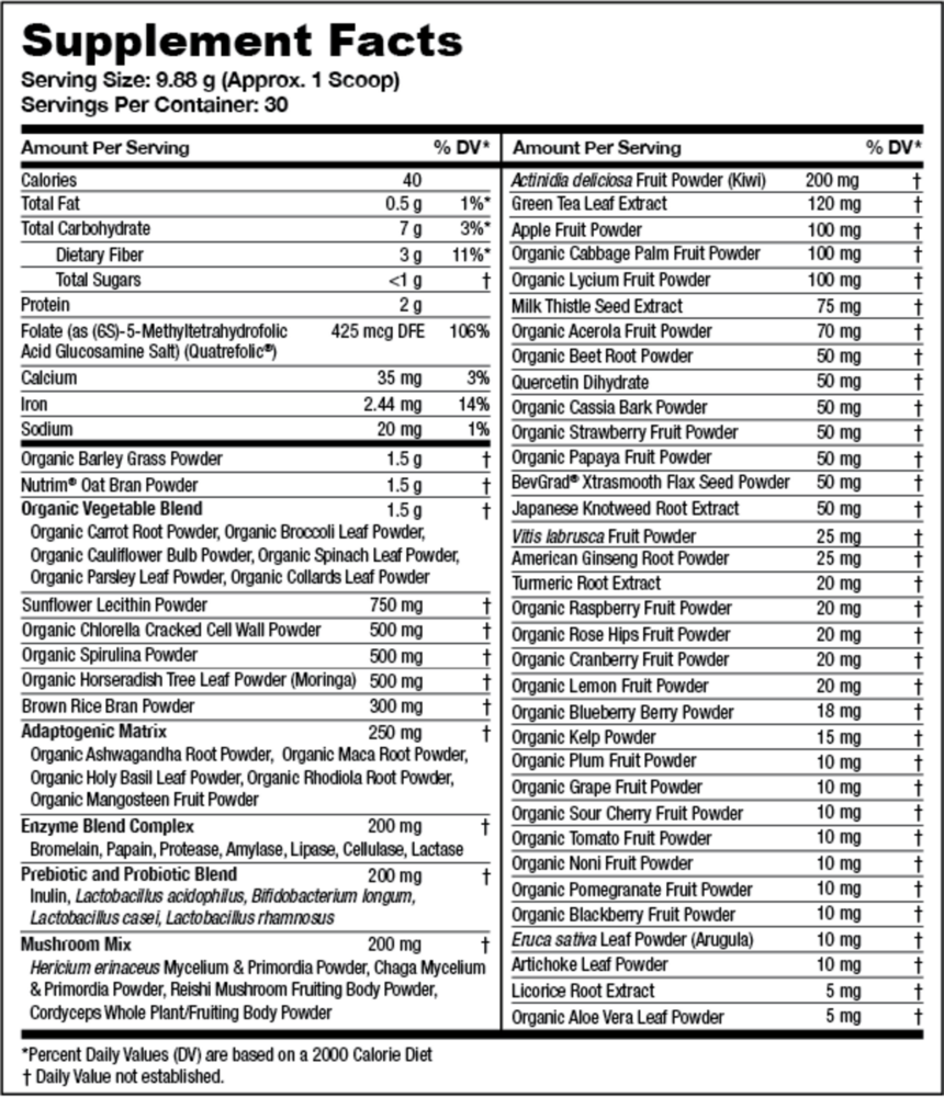 Greens First Pro® is fortified with Beta-Glucan, a USDA patented oat fiber! Greens First Pro® contains 54 different super foods, extracts and concentrates, including supergreens, vegetables, fruits, probiotics, soluble fiber, herbs, spices, natural flavonoids, enzymes and lecithin. Greens First Pro® superfoods are first juiced, then naturally spray dried without solvents at low temperature, leaving all the important nutrients intact.