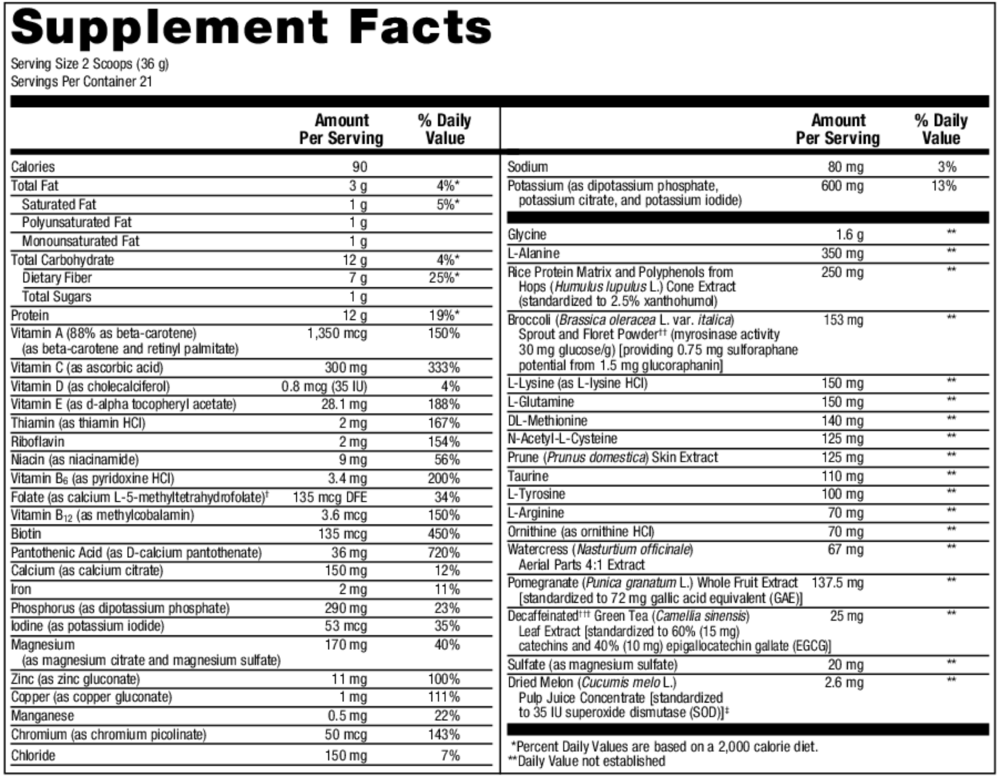 UltraClear® RENEW is formulated to deliver advanced, specialized nutritional support for Phase I, II, and III detoxification, with enhanced support for the body’s natural alkalinization and heavy metal metabolism processes. Formulated in a base of 14.5 g OptiProtein®—12 g of proprietary, vegan pea/rice protein and 2.5 g of added amino acids—this novel formula features xanthohumol as XNT ProMatrix®, broccoli sprout and floret powder as BrassinaseTM, and prune and pomegranate extracts to promote healthy cellular activities. UltraClear RENEW also features glycine and magnesium sulfate to support Phase II detoxification activities, along with N-acetyl-L-cysteine, green tea catechins, and beta-carotene and vitamins C and E to provide antioxidant support.*