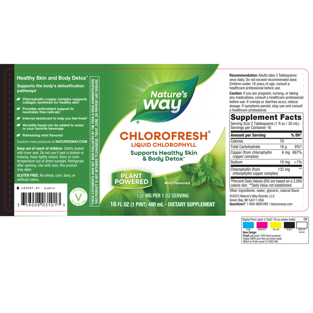 Chlorofresh® is a liquid chlorophyll complex extracted from a premium botanical that is used as an internal deodorant.* Chlorophyll is the pigment that gives plants and algae their green color. Nature’s Way® chlorophyll is derived from white mulberry leaves.