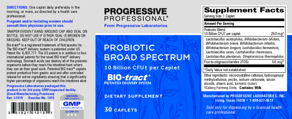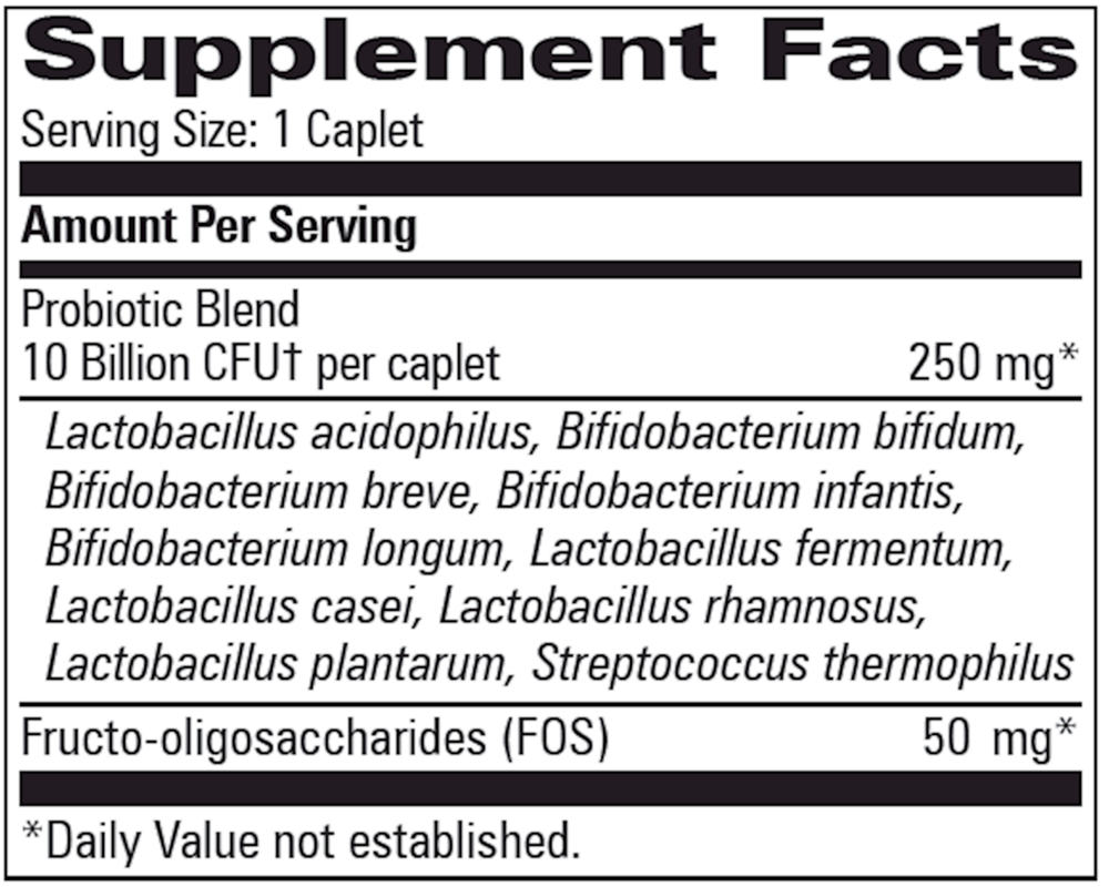 A specially developed probiotic formula featuring 10 high quality probiotic species, for a total of about 10 Billion CFU (colony forming units) per caplet. This product also features the patented BIO-tract® delivery system that protects the live organisms from gastric acid to ensure their delivery into the intestines. This formula also contains fructo-oligosaccharides (FOS) which are added to provide food for bacterial proliferation. The best part is ... No Refrigeration is Required!! Simply keep this product in a cool, dry place for best storage.