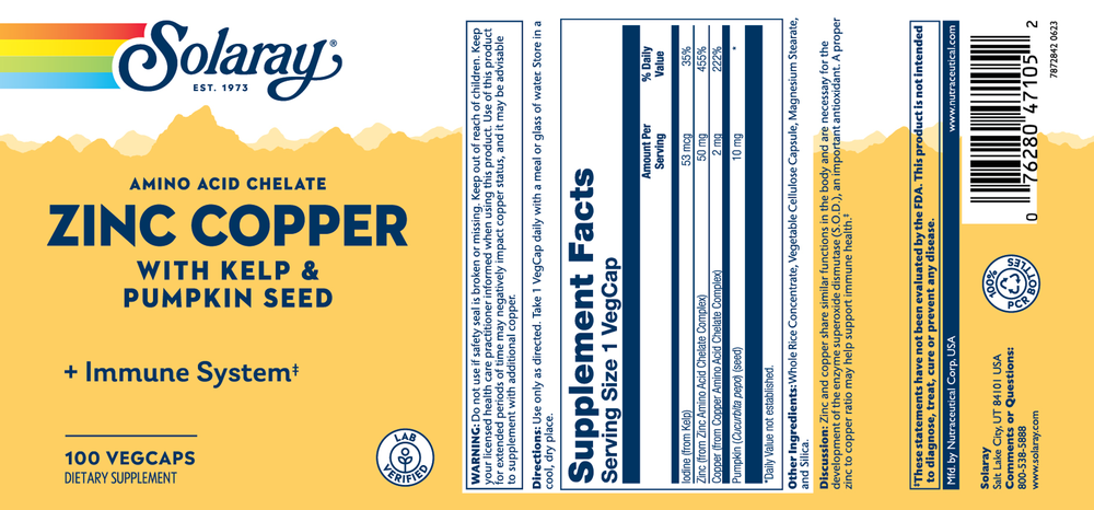 Zinc and copper share similar functions in the body and are necessary for the development of the enzyme superoxide dismutase (S.O.D.), an important antioxidant. A proper zinc to copper ratio may help support healthy cellular and circulatory health. The minerals in this product are reacted with aspartic acid, whole rice concentrate, citric acid and glycine to create a more absorbable chelated complex.