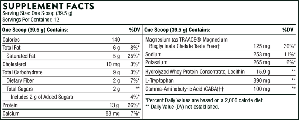 - Contains 13 grams of whey protein to promote muscle repair*- Nighttime consumption has been clinically studied for moderating stress, improving morning alertness, and supporting memory*