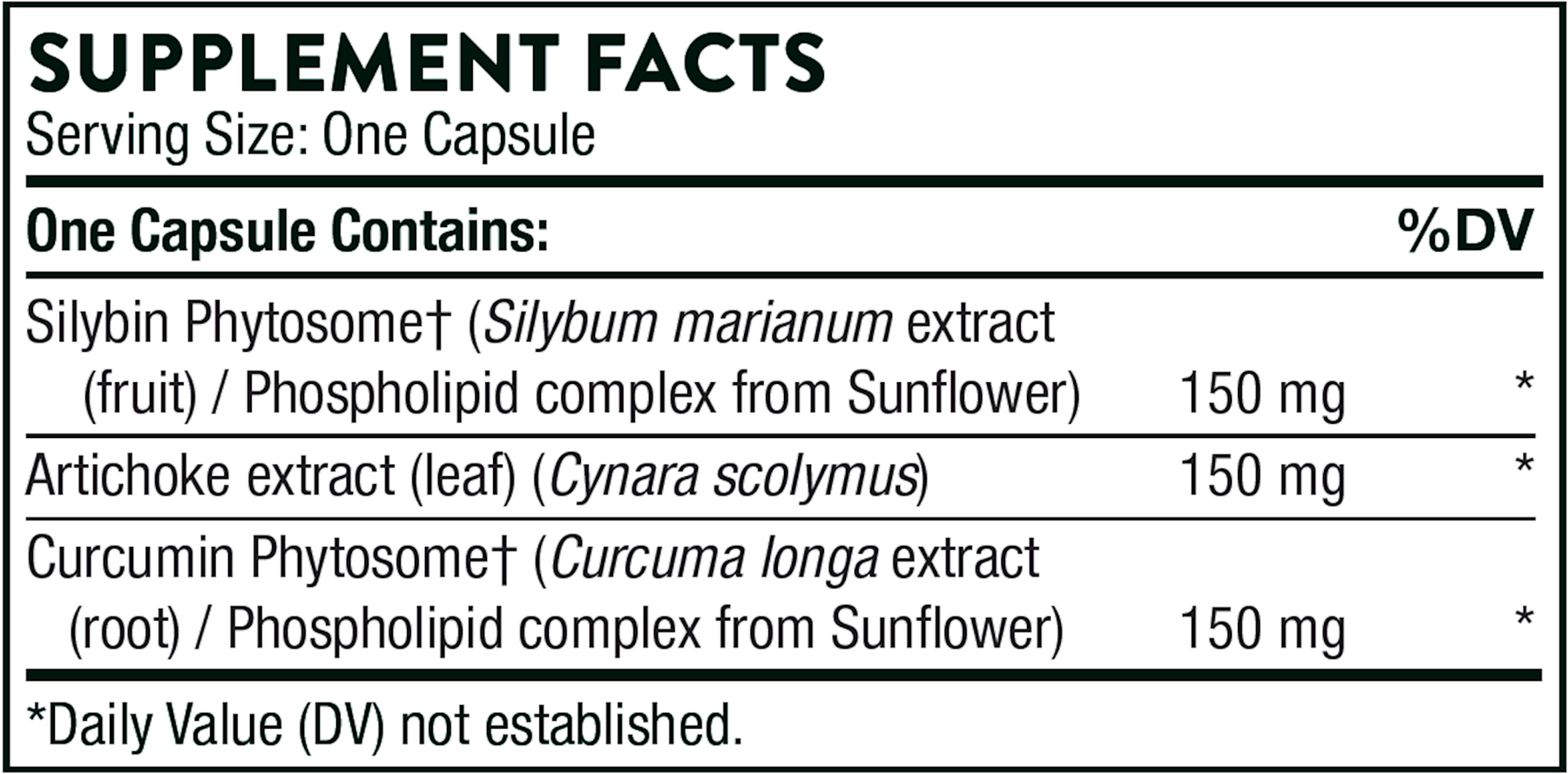 Silybin Phytosome† (Silybum marianum extract (fruit) / Phospholipid complex from Sunflower) | 150 mg | |