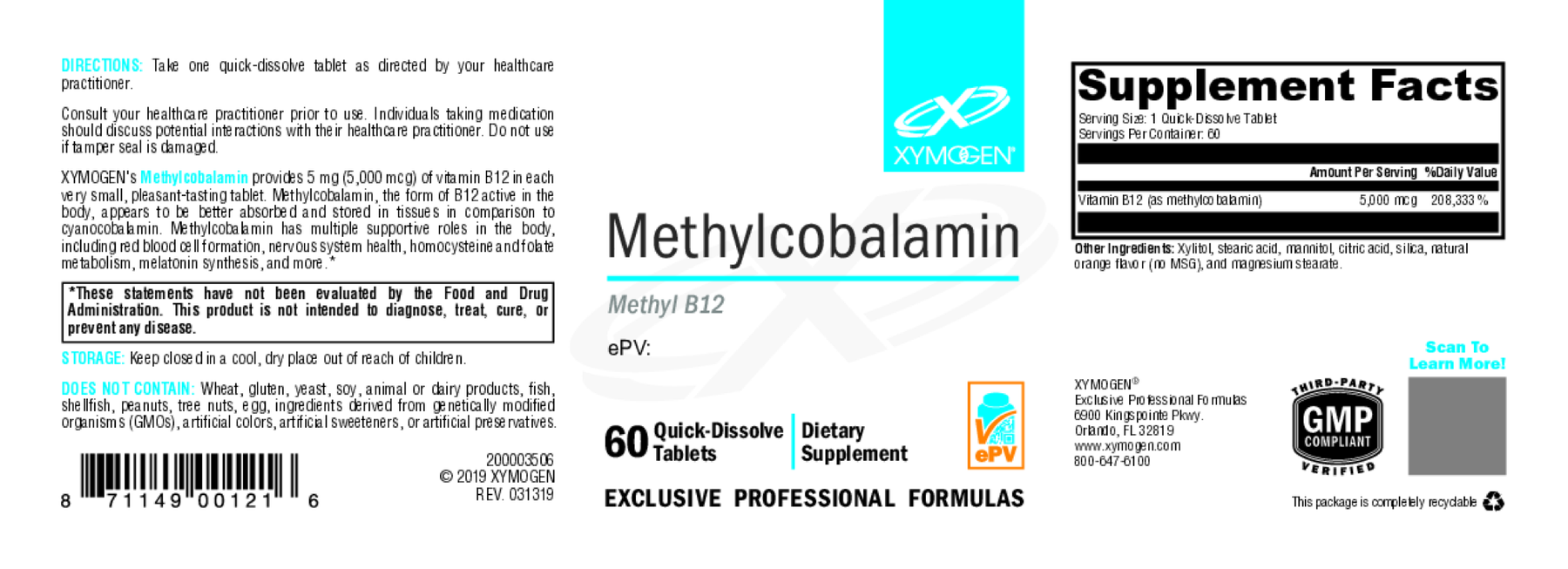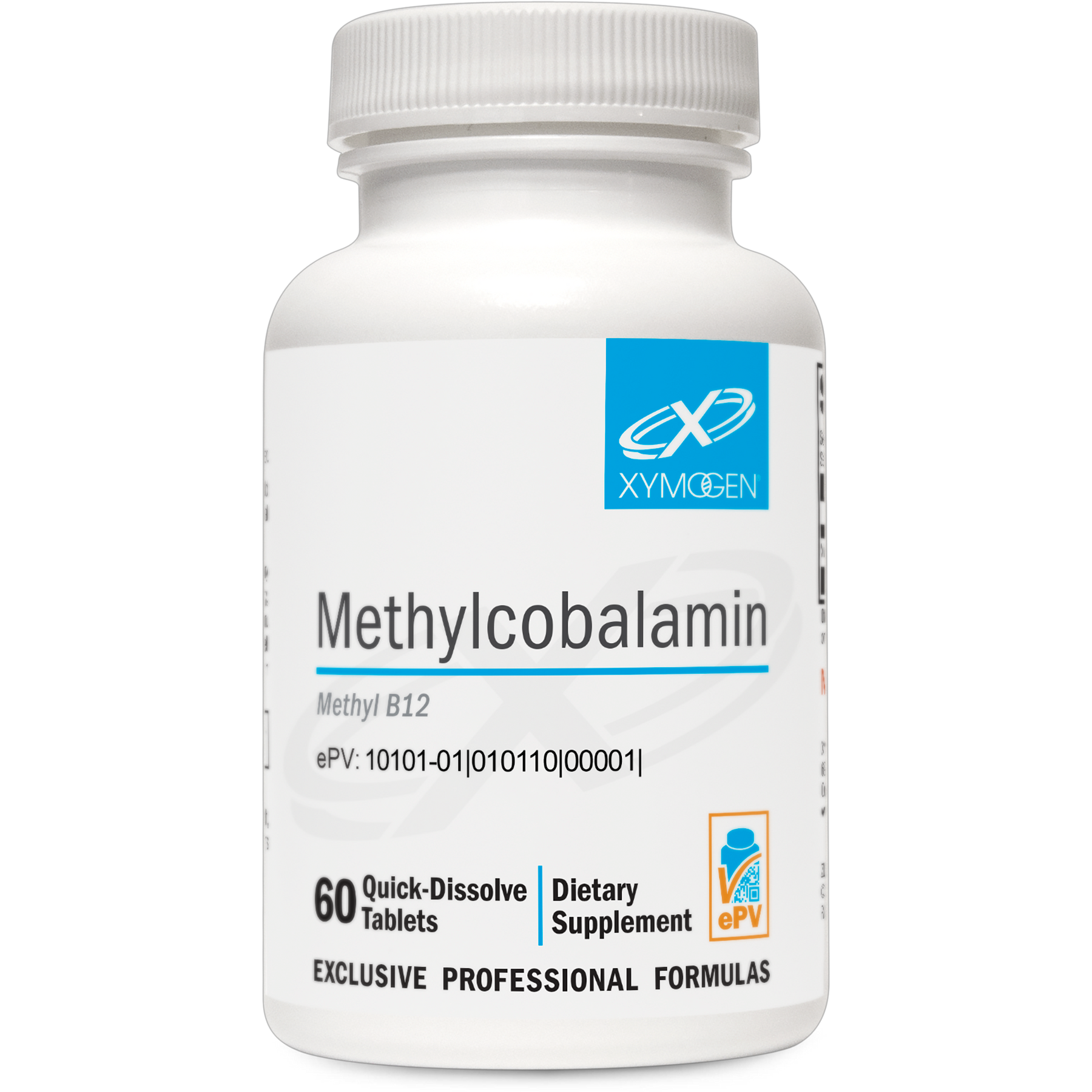 XYMOGEN’s Methylcobalamin provides 5 mg (5,000 mcg) of vitamin B12 in each very small, pleasant-tasting tablet. Methylcobalamin, the form of B12 active in the body, appears to be better absorbed and stored in tissues in comparison to cyanocobalamin. Methylcobalamin has multiple supportive roles in the body, including red blood cell formation, nervous system health, homocysteine and folate metabolism, melatonin synthesis, and more.*